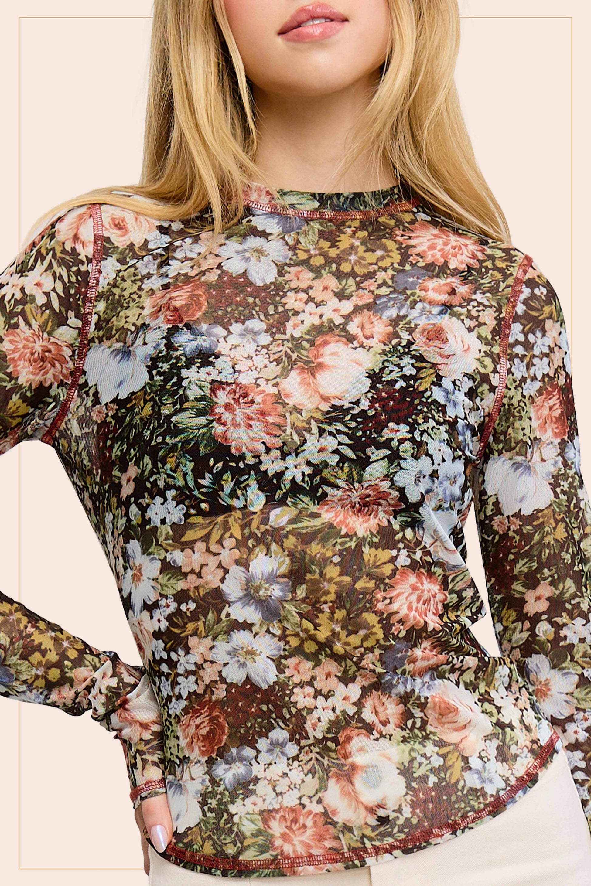 Perfect for layering, this mesh top is featured in a semi sheer design with floral pattern, fitted long sleeves, crew neckline and stretchy fabrication with exposed stitching. This simple top is the perfect lightweight layer throughout all season. Layer up or style solo for a variety look.